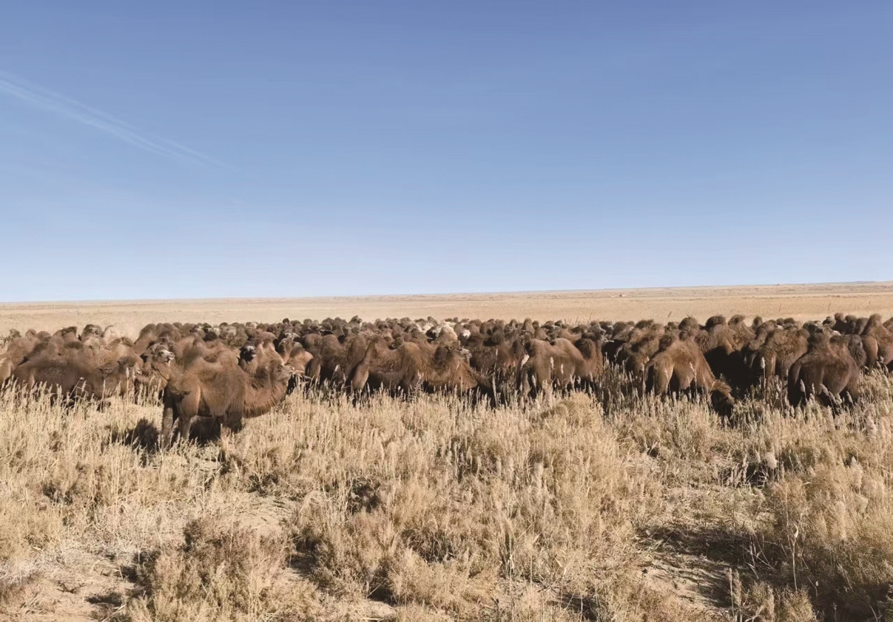 与往年不同的是,如今枯黄的草原下孕育着更旺盛的生机——区域禁牧政策的持续推进,使草场休养生息周期显著延长,冬季牧场残留的牧草更丰茂、水源供给更稳定。“以前转场是为了找活路,现在转场是为了护生态、促增收。”牧民们手持赶驼杆,带着简单行囊与生活用品随行,在传承祖辈转场经验的基础上,他们科学规划迁徙路线,确保骆驼在寒冬中获得优质补给,顺利越冬。