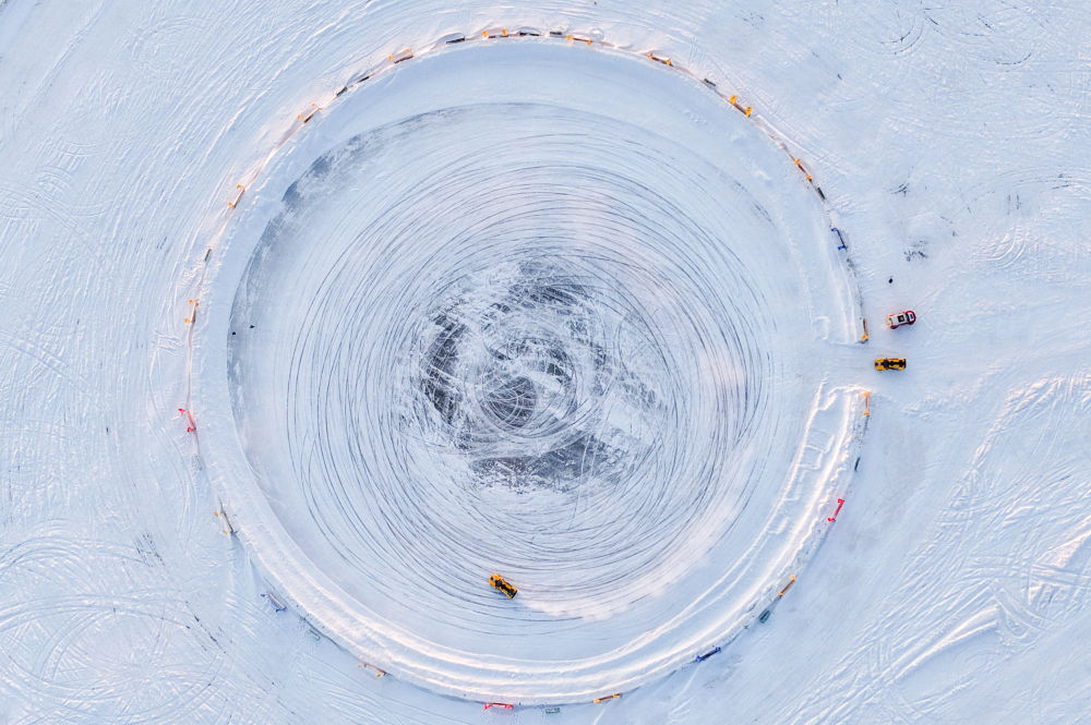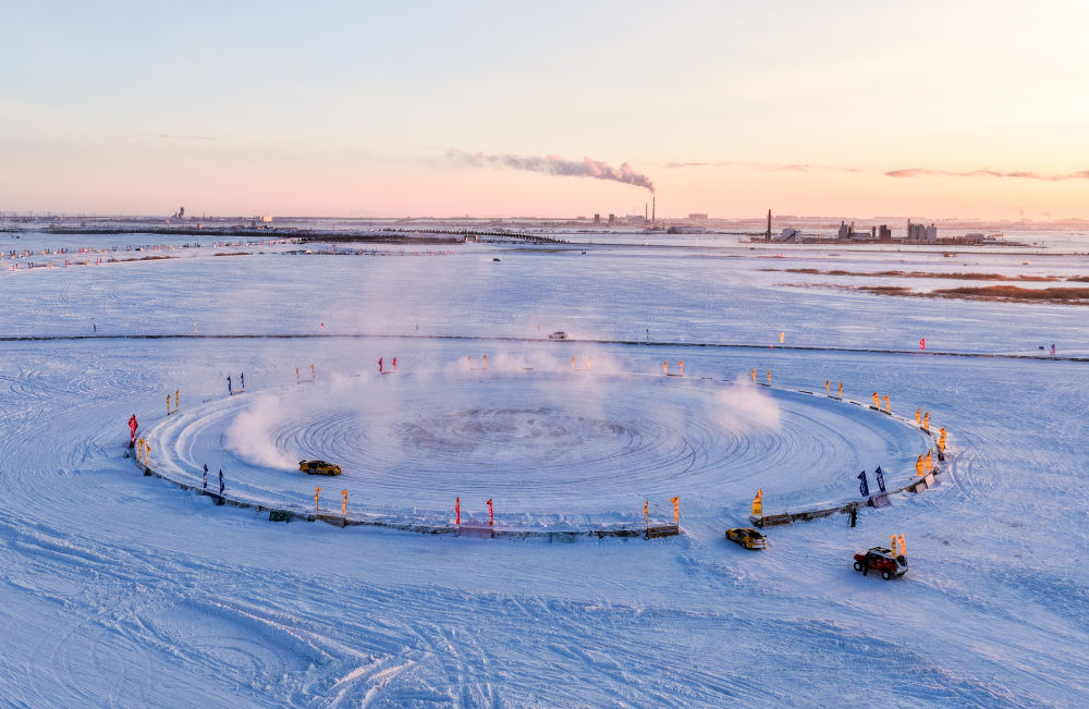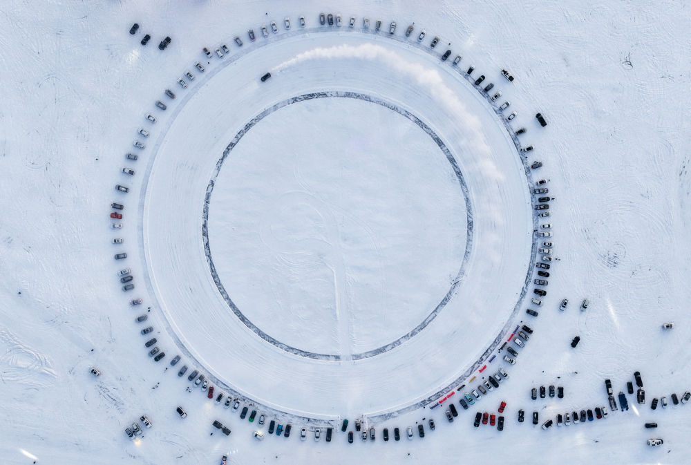 ↑ 车手驾驶赛车在冰面上漂移(无人机照片)。