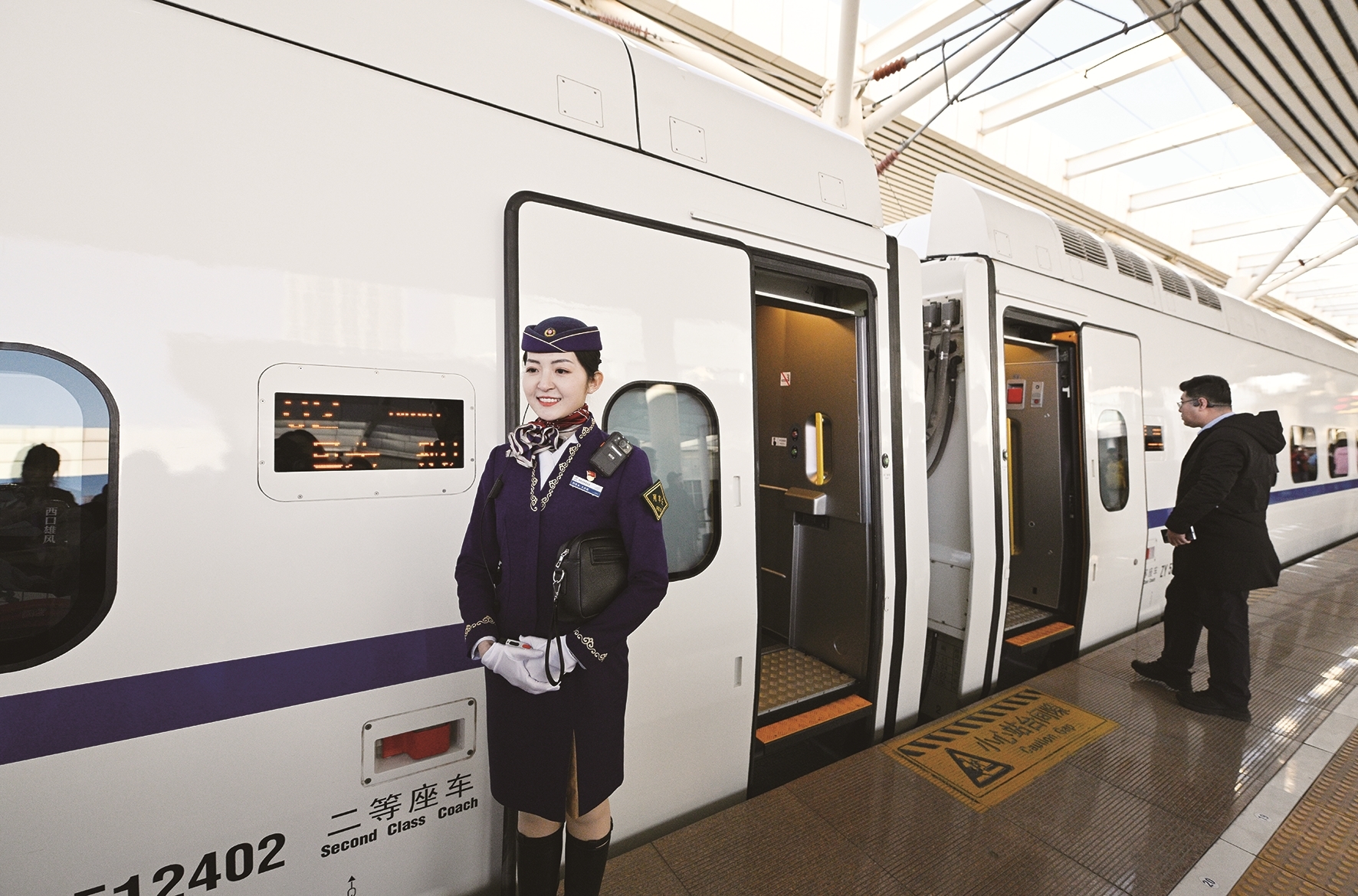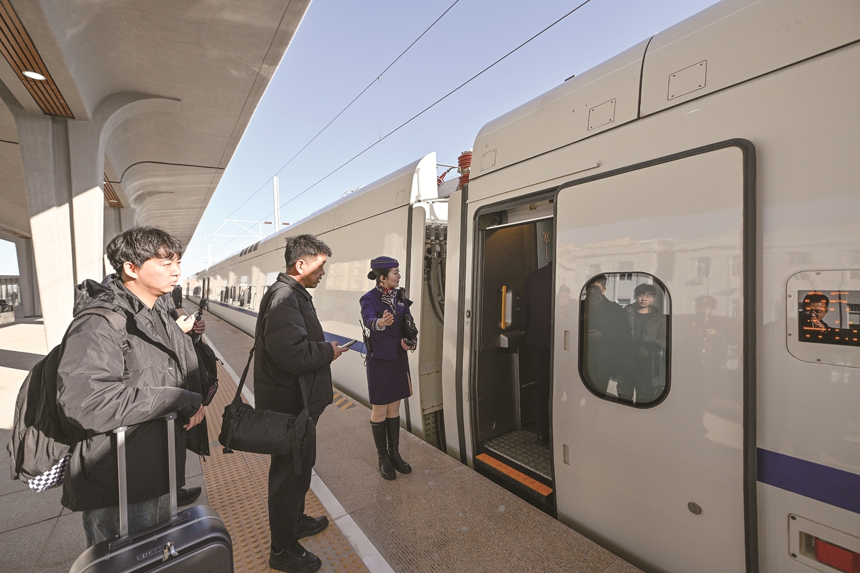 列车的平稳运行与优质服务,离不开背后工作人员的默默付出。车厢里,首发列车安全员张登武正忙碌着检查设备。“能成为首发乘务组的一员,我特别激动和自豪。”他坦言,自己老家在甘肃白银,在内蒙古工作了10多年,以前坐普速列车回家要十五六个小时,现在高铁6个多小时就能到,“这不仅是一条铁路,更是游子与家乡的情感桥梁。”为了胜任岗位,他白天跟车熟悉设备,晚上钻研规章条款,“高铁对安全管理、应急处置要求更高,我会立足岗位,守护每一位旅客平安回家。”