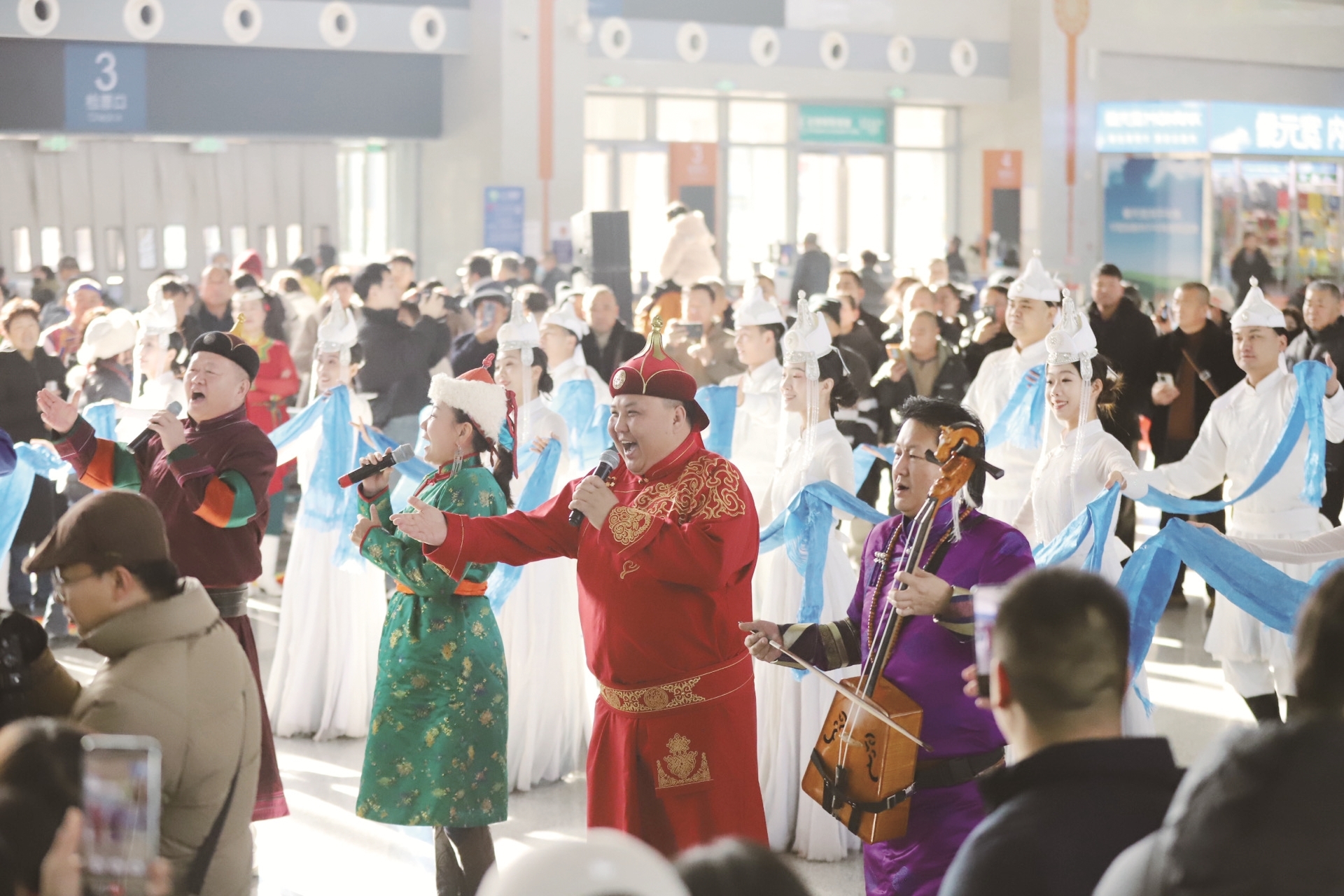 9时整,二楼候车大厅的文艺表演准时拉开帷幕。悠扬的蒙古族长调、欢快的安代舞点燃现场气氛,演员们身着绚丽的服饰,用最真挚的热情表达喜悦。掌声与欢呼声此起彼伏,不少旅客拿出手机记录这精彩瞬间,孩子们更是随着旋律拍手起舞,整个候车大厅化作一片欢乐的海洋,将期盼与喜悦推向高潮。