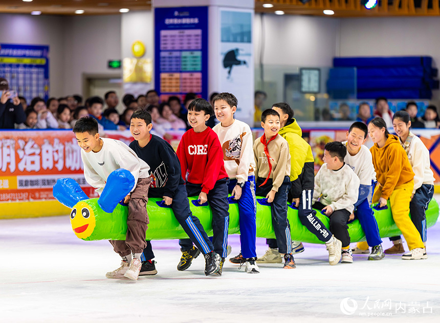 内蒙古呼和浩特市玉泉区小召小学学生在玩冰上毛毛虫趣味游戏。丁根厚摄
