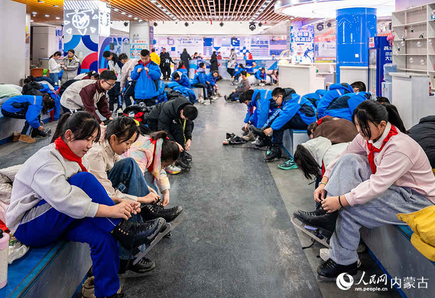 内蒙古呼和浩特市玉泉区小召小学学生在冰场穿冰鞋。丁根厚摄