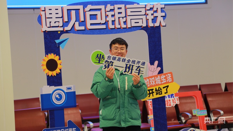 包银高铁首趟列车开行前,乘客在车站拍照留念(央广网记者 杨亚东 摄)