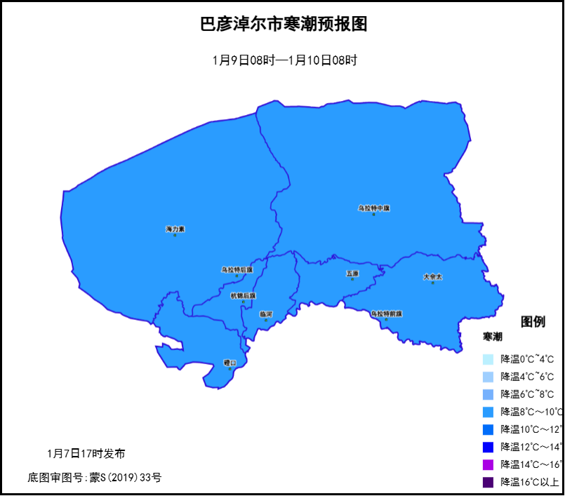 寒潮:9日至10日全市气温下降8℃左右,10日早晨最低气温套区-19~-14℃、北部-23~-20℃,11日早晨气温维持较低。