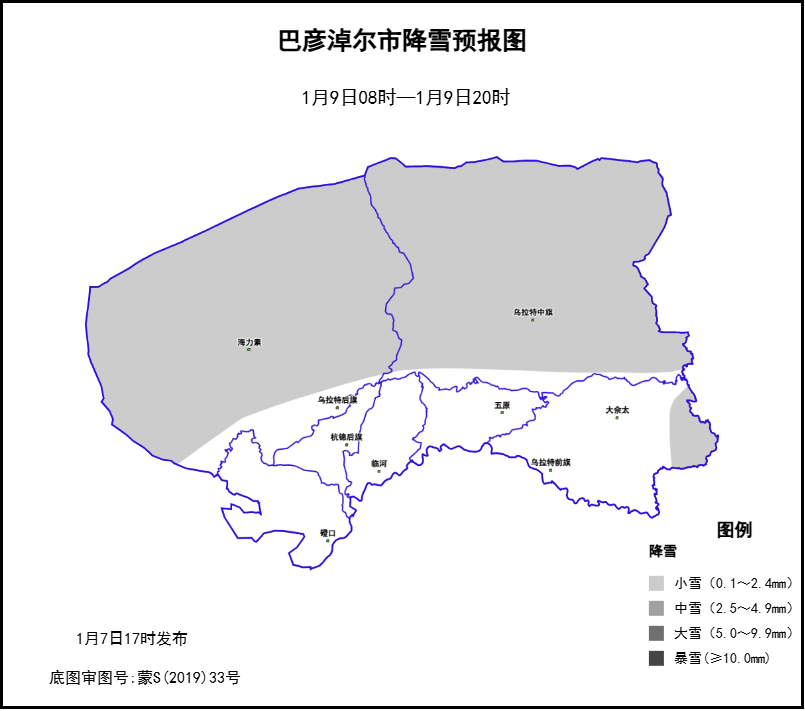 降雪:9日白天乌拉特中旗、乌拉特后旗、乌拉特前旗东部分散小雪,降雪量0~2毫米。