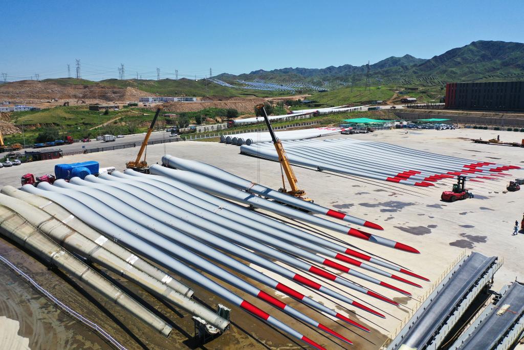 这是2025年7月29日拍摄的包头市明阳新能源智能制造产业园内的风机叶片(无人机照片)。新华社记者 李志鹏 摄