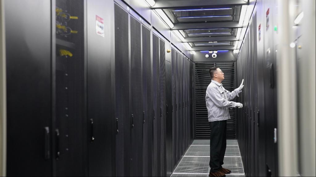 2025年5月20日,工作人员在中国移动智算中心(呼和浩特)机房中维护设备。新华社发(苏雅立摄)