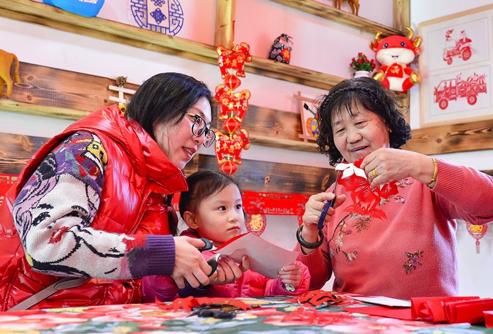 游客们在莫尼山非遗小镇体验剪纸。(呼和浩特市回民区融媒体中心供图)