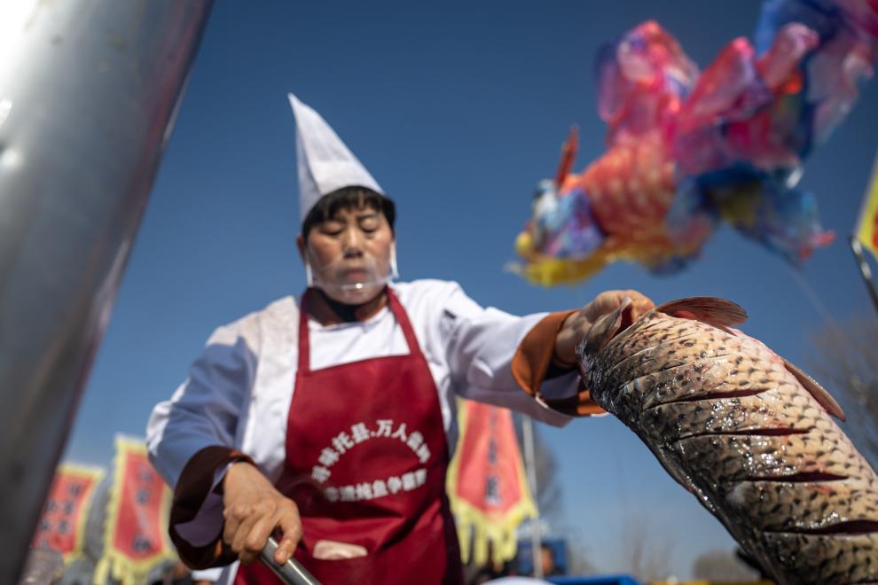 民俗文化周现场,一锅锅炖鱼翻滚出浓郁香气,8口大锅一次炖煮3000斤黄河鲜鱼,供群众及游客免费品鉴。郝家窑村居民郝争平正埋头炖鱼,动作娴熟利落。作为村里第一个开办农家乐的“先行者”,如今他已是当地炖鱼争霸赛的主厨之一。