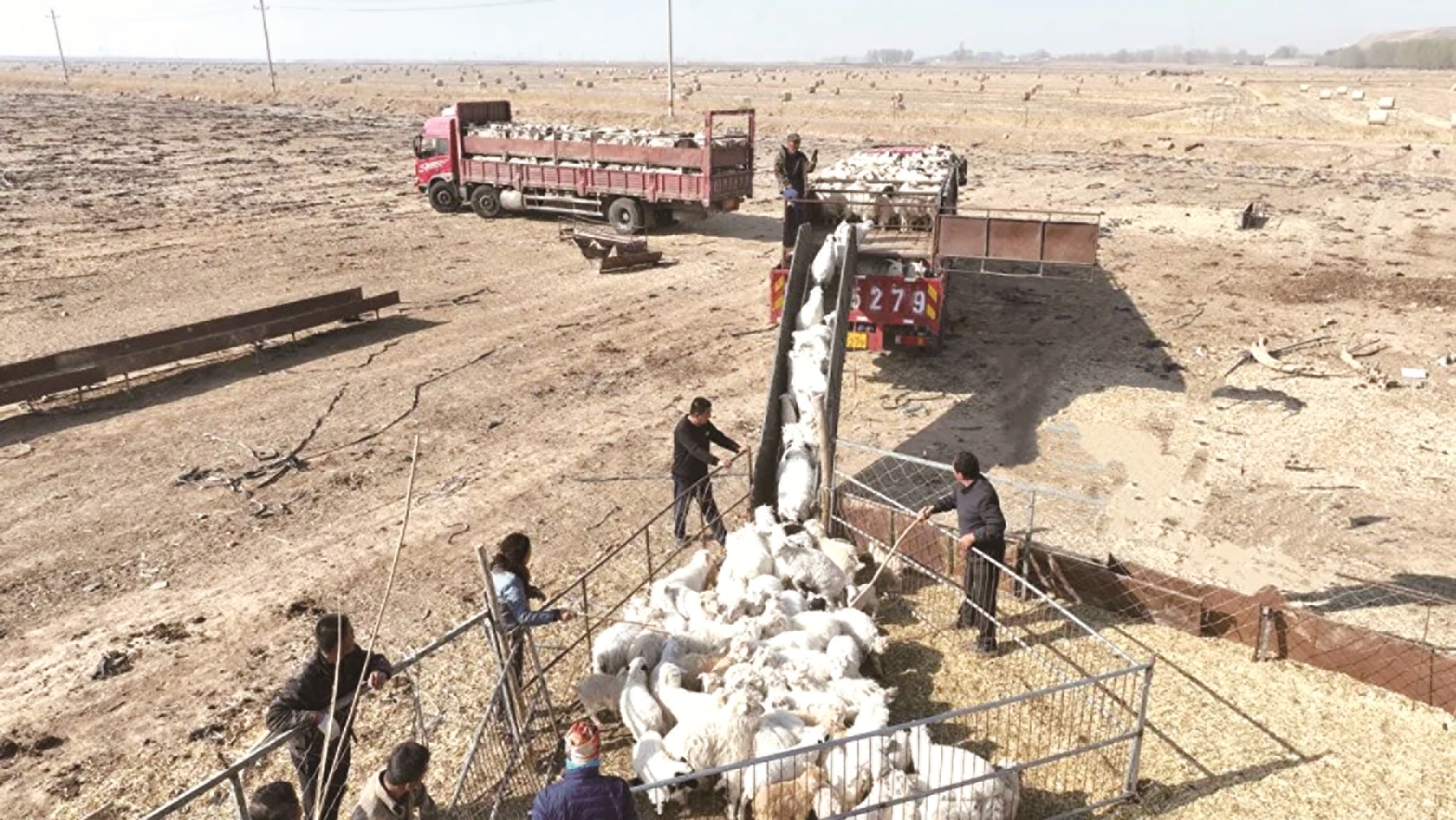 临行前,梁五挥手告别前来帮忙的村民常海中。车子缓缓驶出村子,一路向北,3个多小时后,稳稳停在了梁五家的草场上。车门一开,群羊便争先恐后地跳了下去,梁五和家人熟练地将羊群归拢,赶入羊圈。